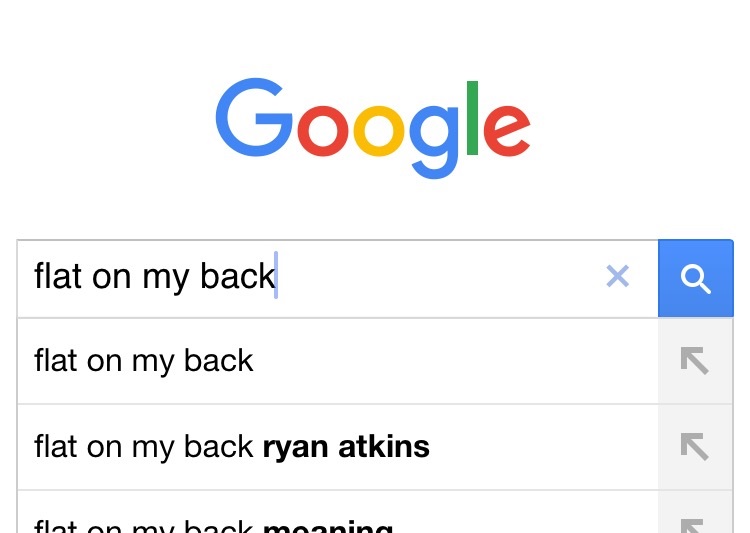 My lifelong dream had been completed. I had achieved the enviable status of having my website pop up at the top of the Google search. Need help finding the site after hearing it mentioned somewhere? Simply type in “flat on…” and Google automatically suggests “flat on my back ryan atkins.”